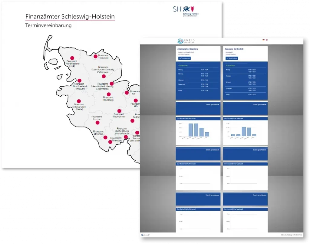 With the help of an iFrame, you can display data from your cleverQ queuing system anywhere on your website and provide your customers & citizens with information about the current queue, or provide an individual summary page of your locations with a link to online appointment booking.